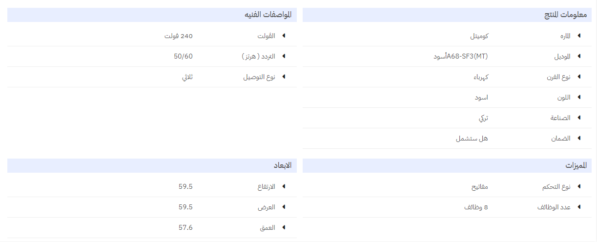 فرن بلت ان كهرباء كوميتل 60 سم 8 وظائف اسود (تركي)
