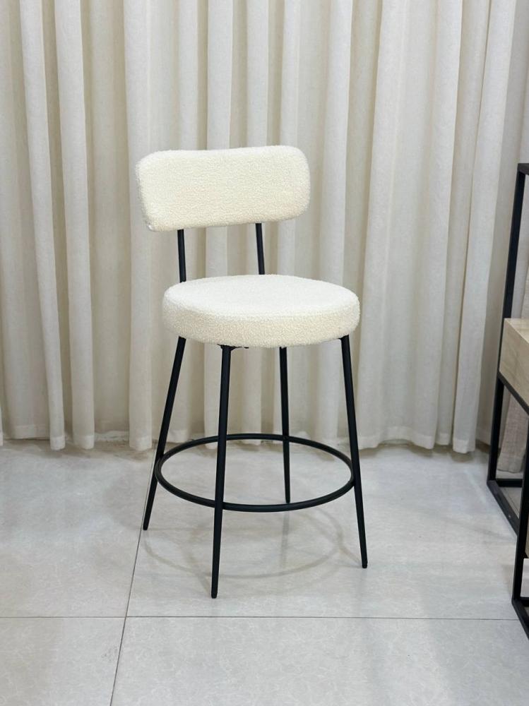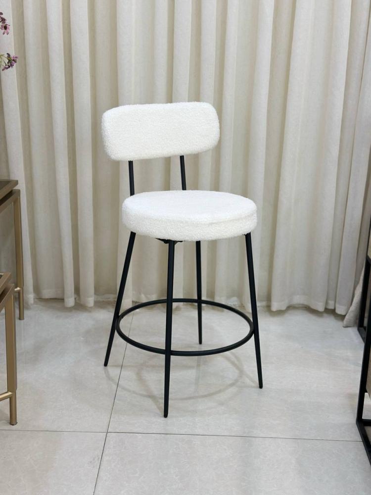 كرسي بار مرتفع بقماش أبيض يجمع بين الأناقة العصرية والراحة العملية،