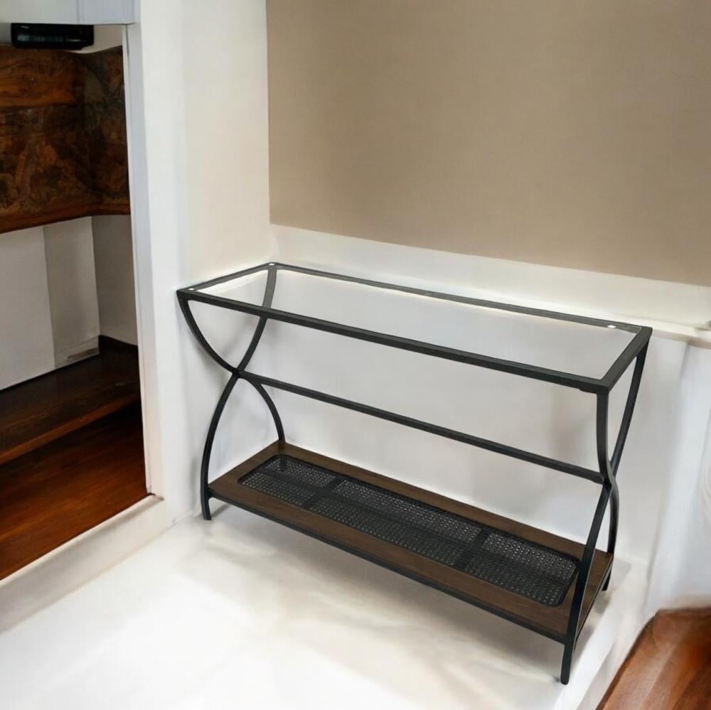 "مدخل دورين بتصميم راقٍ يجمع بين العملية والجمال. يتميز السطح الزجاجي الأنيق بجودة عالية، ما يضفي مظهرًا عصريًا ويعكس الإضاءة بشكل مثالي، مع قاعدة وأرفف مصنوعة من الخشب الطبيعي بتشطيبات دقيقة ومزينة بتفاصيل من الرتان الفاخر.